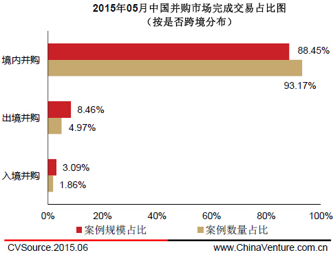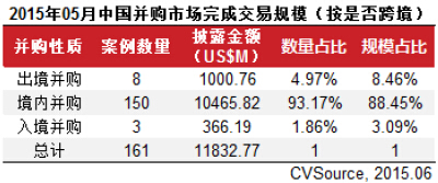 图4 2015年05月中国并购市场完成交易金额按行业分布 表3 2015年05月中国并购市场完成交易规模(按行业) 境内并购仍是主要渠道 根据CVSource投中数据终端显示