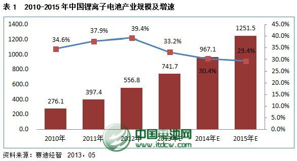 未来五年,传统小型锂离子电池将在平板电脑和超级本的带动下呈现稳定增长的趋势,动力电池和储能电池将是锂离子电池产业新的增长点。预计到“十二五”末将增长到1251.5亿元,复合增长率预计达到30%以上。
