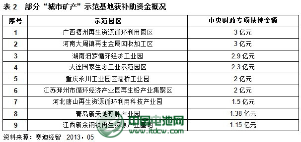 “城市矿产”示范基地是享有优惠政策、提升园区竞争力的重要途径。目前国家对“城市矿产”示范基地给予一定程度补贴,在具体补贴上,国家补贴给园区,最终落实到园区的项目里。补助方式为预拨和清算相结合,预拨不超过项目补贴资金的15%。按照不同项目的规模和延伸度、投资力度,国家为每个示范基地提供10%的资金配比。整体来看,国家对“城市矿产”扶持力度相当大。例如广西梧州再生资源循环利用园区获国家发改委、财政部联合批复,获得中央财政专项资金3亿元,大大提高了“城市矿产”示范基地的建设力度与竞争力。河南大周镇再生金属回收加工区成为国家“城市矿产”示范基地之后,得到3亿元扶持资金,前期启动资金2000万元已拨付到位。