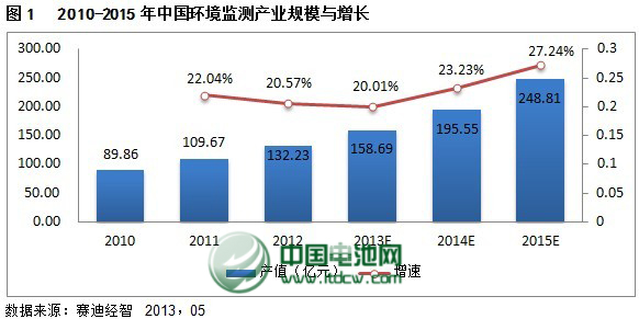 2012年,全国环境监测产业规模达132亿元,同比增长21%,其中环境质量监测48亿元,同比增长10%;污染源监测产业规模达62亿元,同比增长28%;其他环境监测领域产业规模22亿元,同比增长21%。随着环境质量监测、污染源监测、应急监测等领域在覆盖面和监测指标的不断扩大和丰富,预计“十二五”期间,环境监测产业将保持22.6%的速度增长,到2015年产业规模将达到249亿元。