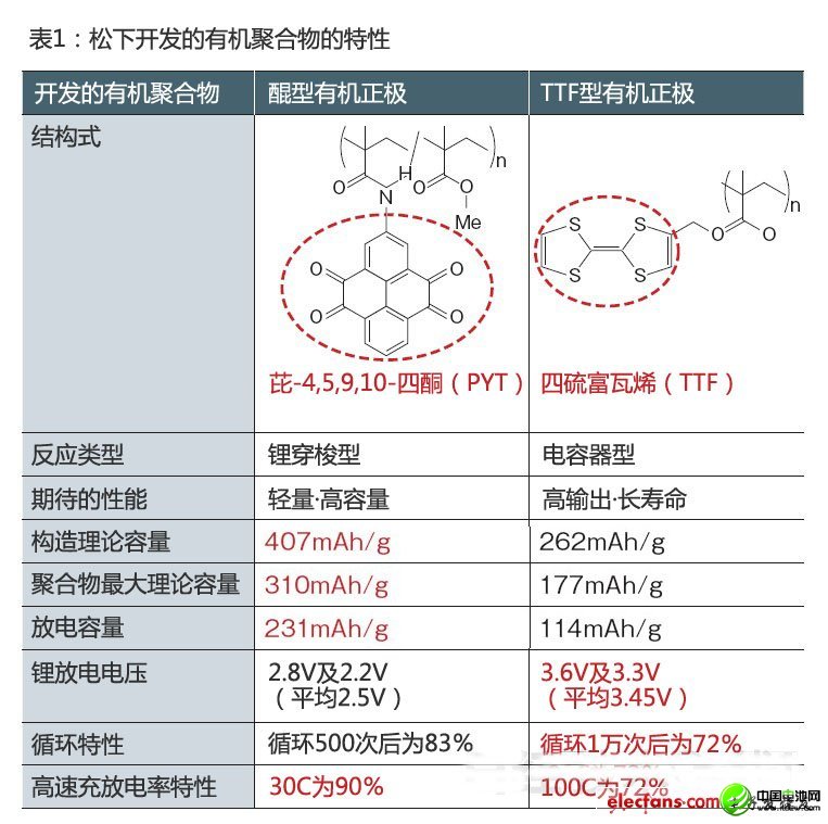 松下正在开发能量密度高的醌型和输出密度高的TTF型有机充电电池。(图:松下)