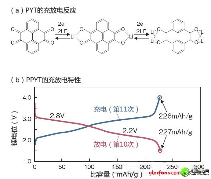 醌型采用了可实现四电子反应的PYT(a)。高分子化的PPYT的平均电压为2.5V(b)。(图:松下)
