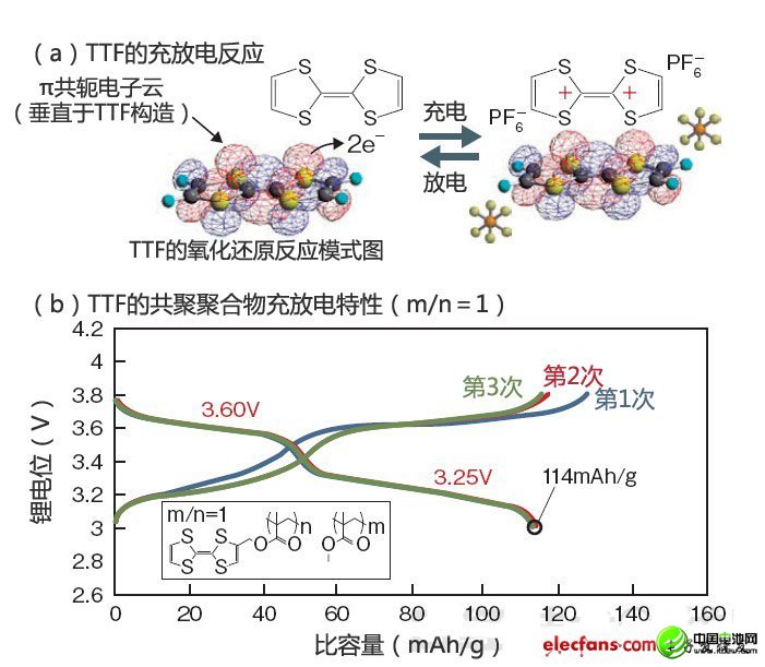 TTF型的氧化还元利用了π共轭电子云(a)。共聚TTF聚合物的平均电压为3.45V(b)。(图:松下)