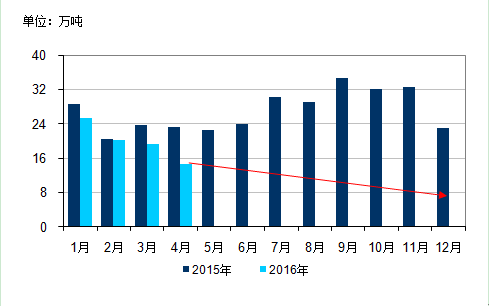 图:2015-2016年锌精矿月进口量(数据来源:中国海关)