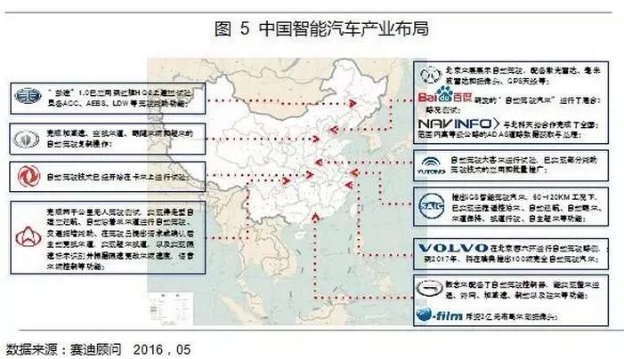 国内智能汽车相关企业主要布局在东部沿海城市。国内整车厂商也纷纷进行自动驾驶技术的研发、测试及应用,一汽、长安、北汽、长城等厂商研发的智能汽车均通过了试验,部分整车厂已将部分辅助驾驶功能应用到产品上;同时,四维图新、百度等电子供应商及IT企业加大投资及研发力度,加快智能汽车的产业化进程。从产业分布情况来看,目前国内智能汽车产业相关企业,主要依托当地已有汽车产业基础,集中分布在东北沿海城市。