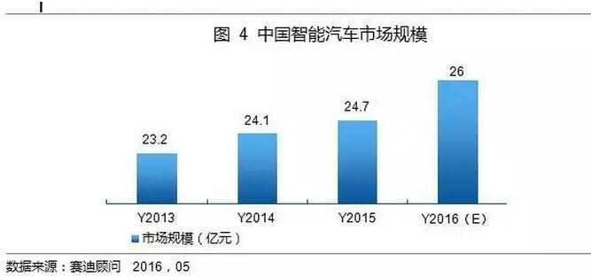 在国内市场上,2015年国内智能汽车市场规模约25亿元。相比全球市场,国内的辅助驾驶系统市场渗透率总体水平较低。尽管合资品牌的辅助驾驶系统市场渗透率相对自主品牌高,尤其是中高端轿车及SUV车型中,但目前国内自动驾驶技术尚处于初级驾驶辅助阶段,具备一项或多项局部自动驾驶功能。实现L1阶段的辅助驾驶功能需要500美元左右的投入,赛迪顾问研究认为,2015年国内辅助驾驶系统带来的市场规模约24.7亿元,预计2016年国内汽车销量突破2580万辆,辅助驾驶系统市场规模有望达到26亿元,如图4所示。
