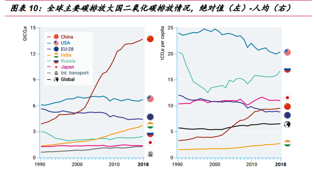 我国减排任务艰巨,年排放量位居世界第一。根据联合国数据,2018 年中国碳 排放达到 137 亿吨,同比增长 1.6%。尽管我国碳排放的增速已经放缓,但从总量看, 占全球总排放量的 1/4 以上,仍是全球排名第一的碳排放国。作为世界工厂,在产业 链日趋完善、国产制造加工能力与日俱增的同时,我国的碳排放量也快速攀升。作为 负责任的大国,走低碳节能发展之路既是我国的责任所系,亦是使命所向。