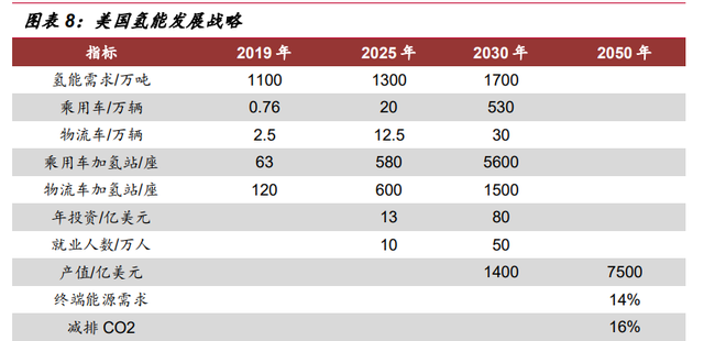 2014 年美国颁布的《全面能源战略》确定了氢能在交通转型中的引领作用,并 规划 2030~2040 年将全面实现氢能源经济。美国能源部 2019 年提出了《国家氢能 发展路线图》。目前美国氢能重点发展领域一是开展燃料电池系统研发,各级政府均 提供大量资金资助科研机构进行氢能和燃料电池关键零件研发工作。二是布局建设加 氢站,如美国加州每年计划拨款 2000 万美元用于加氢站建设,直到加州至少有 100 座加氢站;到 2025 年建立 200 座加氢站。截至 2018 年底,美国建有加氢站 42 座, 氢燃料车 5899 辆。