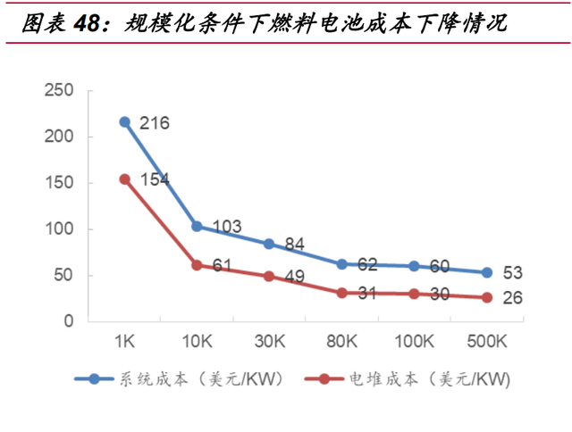目前在下游系统、电堆环节,国产企业已经实现产品批量供应,随着膜电极国产 化的逐步深入,燃料电池产业链已经基本实现国产化。但产业链中质子交换膜、碳纸 等材料环节仍处于研发或小批量试制阶段,持续引导国产化推进,实现技术独立可控 对成本下降意义重大。此外由于产业规模尚小,同时 MEA 等部件国产化时点较晚, 造成目前除了系统、电堆龙头企业外,大部分国产化产品尚未能形成大规模,长周期 应用,政策扶持期将提供国产部件的规模化应用及技术提升的空间。