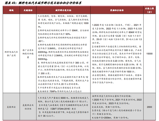 2020 年 9 月,财政部、工业和信息化部、科技部等 5 部门联合发布了《关于开展燃料电池汽车示范应用的通知》,明确燃料电池汽车示范期间,将采取“以奖代补” 方式,对入围示范的城市群按照其目标完成情况给予奖励。