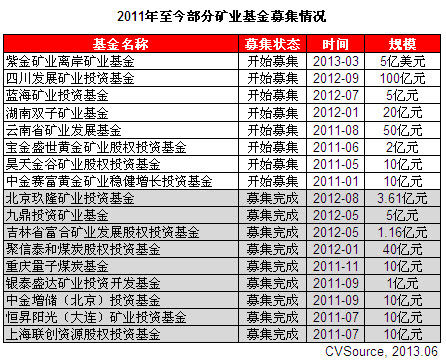 在PE行业竞争不断加剧的背景下,专业化基金已经渐成主流,矿业领域由于其专业程度高、政策性强等特点受到了VC/PE机构的关注。2012年5月,九鼎投资旗下首只矿业基金——九鼎投资矿业基金募集完成,规模达5亿元,主要关注能源、金属矿产与非金属矿产等领域,投资方向主要包括优质成熟型、高速成长型矿业企业参股投资,以及具有重大并购价值的矿业企业并购投资。