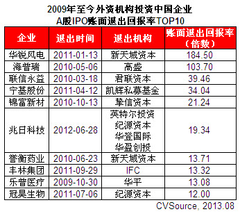 表2 2009年至今外资机构投资中国企业A股IPO账面退出回报TOP10
