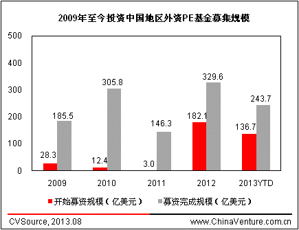 根据ChinaVenture投中集团旗下金融数据产品CVSource 统计显示,2009-2011年投资中国地区的外资PE基金成立数量和目标规模整体处于较低水平,2012年呈现爆发式增长,全年共披露20支外资PE基金成立并开始募集,总计目标规模182.1亿美元。2013年至今,共披露12支外资PE基金成立并开始募集,总计目标规模136.7亿美元,新基金成立仍较为活跃。