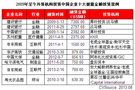 表1 2009年至今外资机构投资中国企业十大披露金额投资案例
