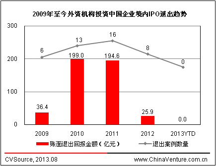 根据ChinaVenture投中集团旗下数据产品CVSource统计显示,2009-2011年,外资机构投资中国企业A股IPO退出案例数量逐年上升,2011年达到了16起,创下历年新高。2010年和2011年累计账面退出金额分别为199.0亿元、194.6亿元。其中,2011年的华锐风电,2010年的海普瑞与九州通(两家加总)为外资机构带来的账面回报均超过100亿元,在当年统计数据中占据重要地位。2012年以来,在宏观经济及资本市场缺乏利好因素的形势下,PE市场持续低迷,退出渠道有所收窄。2012年,外资机构投资中国企业A股IPO退出案例仅有8起,累计实现账面退出金额25.9亿元,退出案例数量和退出金额均出现大幅下滑。2013年,A股IPO持续冰封,没有企业实现IPO退出(见图4)。