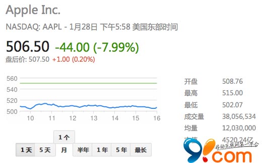 小编点评:即使上一季度iPhone和iPad的销售数字都十分抢眼,再加之苹果与中国移动达成合作,但依然未达到外界预期。股价也无法挽回的一路下跌。