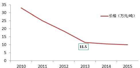 尽管天赐材料实现了六氟磷酸锂的自给自足,但随着国内企业在六氟磷酸锂技术上的不断突破,国产化率逐渐的提高,其价格也在逐渐的下滑,预计2013年价格11.5万元/吨左右,较2011年下降了65.2%。