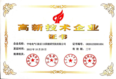 近日,由国家科技部、国家税务总局、财政部等三部委联合成立的“全国高新技术企业认定管理工作领导小组”,委托各省、市、自治区科技部门组织的国家级高新技术企业的审核和认定工作全面结束,中电电气太阳能研究院顺利通过了2012年第二批国家高新技术企业认定,正式获得国家高新技术企业认证证书。