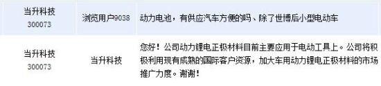11月11日讯 当升科技(300073)周二下午在全景网互动平台向投资者表示,公司动力锂电正极材料目前主要应用于电动工具上。公司称,将积极利用现有成熟的国际客户资源,加大车用动力锂电正极材料的市场推广力度。当升科技主要从事钴酸锂、多元材料、锰酸锂等小型锂电、动力锂电正极材料的研发、生产和销售业务。