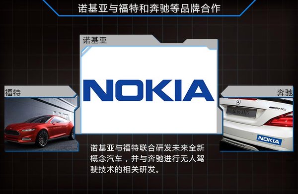 在国内有着“最耐摔”手机之称的诺基亚品牌,同样也涉足到汽车行业中,利用电子科技实现更深层次的个性化服务。诺基亚地理位置及商务产业部作为福特汽车的集成商之一,正共同努力将这种智能技术推向市场,通过电脑和感应技术让驾驶成为一种享受。此外,诺基亚和奔驰也联合一个团队,利用诺基亚特有技术的优势,为智能汽车建立一个3D智能地图,竞争汽车无人驾驶技术这一新兴领域。