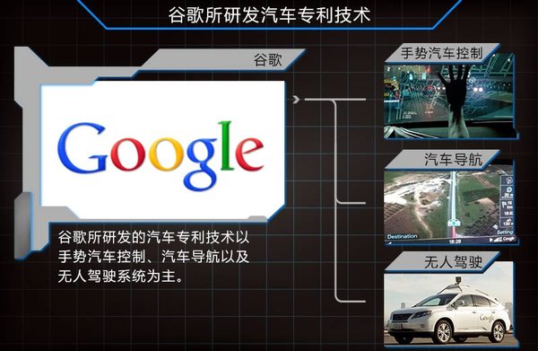目前谷歌所拥有的汽车技术专利项目,主要包括汽车导航、手势汽车控制和无人驾驶系统,并且还包括只能设备和整车集成技术等不同科技。其中大多数专利是来自于其日前正式收购的摩托罗拉公司。不过在无人驾驶汽车方面,谷歌在2005年便已开始进行相关研发、并已搭载到丰田普锐斯、奥迪TT和雷克萨斯RX等多个级别产品。