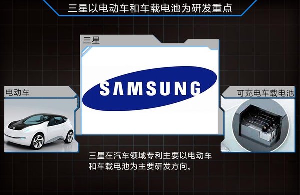 另外韩系科技行业巨头三星来说,其目前共拥有234项公布专利,并且还有199项专利处于未公布阶段。而在已公布的专利项目中,电动车和可充电车载电池是该集团主要研发的项目。可以从中看出三星将未来汽车的发展重点定位在新能源领域,并且其目前已有名为“电动车及其控制方法”和“机动车电池管理系统和方法”等多项技术课题。