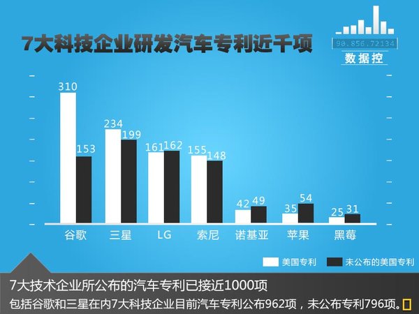 目前包括谷歌、三星、LG、索尼、诺基亚、苹果以及黑莓在内的7家厂商,已在美国申请并公布了962项设计汽车领域的专利技术,其中大部分涉及车载导航应用、新能源汽车和电动车型驱动等方面。而在上市科技企业中谷歌共拥有310项已公布的专利项目和153项尚未公布的专利技术,其也成为了在汽车领域研发专利最多的IT企业。