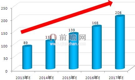 图表:2013-2017年中国锂电池正极材料市场规模预测(单位:亿元)
