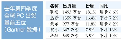 联想在去年第四季度仍是全球最大的PC厂商,并再次扩大与第二名惠普之间的市场份额差距,两者的市场份额差距已达到1.7%。根据Gartner的数据显示,联想在除亚太以外的所有地区市场均呈现强劲增长,并在本季度以1493万台的出货量占据PC厂商第一的位置,占据全球出货量的18.1%,而惠普在第四季度出货量下滑高达7.2%,在美国、拉美两大区域表现不佳。同时,数据显示,2013年第四季度,美国PC出货总量为1580万台,同比下降7.5%。