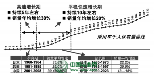 李伟利认为,2001年到2008年,中国汽车市场处于孕育期,年均增速超过30%,2009年后,随着汽车保有量大量增加,我国进入汽车普及期,这期间,乘用车市场增速约为GDP增速的1.5倍。他还预计,以未来我国总人口15亿测算,中国汽车销量饱和水平可能会达到6000万辆这一惊人数字。