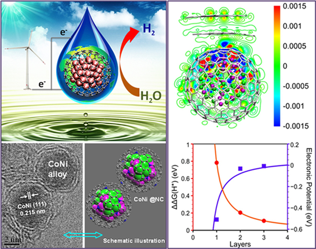 采用廉价和储量丰富的非贵金属替代稀有的贵金属作为催化剂,实现重要能源和化工过程的高效转化是当今催化科学和化学化工研究的热点。近日,中国科学院大连化学物理研究所催化基础国家重点实验室副研究员邓德会和中科院院士包信和带领的研究团队在长期深入研究纳米碳材料催化的基础上,通过创新二维纳米碳材料(类石墨烯材料)的制备策略和合成方法,成功实现了均一的超薄石墨烯壳层(一般为1-3碳层)对3d过渡金属纳米粒子的包裹和封装。理论模拟和实验研究表明,在催化反应过程中,活性金属纳米粒子催化剂在纳米碳空腔中的封装阻断了其与苛刻反应环境(如酸性、碱性和强氧化性等)的直接接触,有效地延缓和阻止了催化剂的失活,同时,被包裹的纳米金属的活性价电子通过与类石墨烯碳层的相互作用“穿透(penetration)”到外表面,实现了高效催化反应。基于这一原理制备得到的石墨烯碳层封装的纳米钴-镍催化剂应用于强酸性条件下电解水制氢反应(HER),表现出了优异的催化活性和稳定性,在电流密度为10 mA/cm2 的条件下,电解水阴极过电位仅为142 mV,性能接近于通常采用的40%Pt/C催化剂,相关结果于近日在《德国应用化学》(Angew. Chem. Int. Ed., 2015, DOI: 10.1002/anie.201409524)在线发表,并被该期刊选为“热点文章(Hot Paper)”。