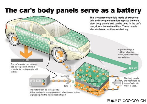 由于采用这样的电池生产技术之后,可将电池制成车门板、发动机盖、车顶,甚至轮圈盖的样式。可有效节省车辆的空间,电池组可透过充电器或是汽车刹车(能量回收系统)为其充电,由于采用全新材料制成的电池,其充电速度要比传统电池组快很多。此外由于采用碳纤维材料打造的电池外壳,其特点在于坚固并附有弹性,即使在车辆发生碰撞时也不会导致电池组被破坏。