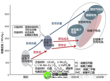 图2:计划2020年实现300Wh/kg的能量密度 目前推进的材料开发的目标是,2020年在确保安全性的同时使能量密度达到300Wh/kg。2030年使Li-S电池和锂空气电池等500Wh/kg以上的新一代电池实现实用化。 |