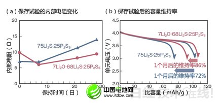 图9:具备高容量维持率的固体电解质 丰田确认,作为全固体电池的固体电解质,具备高耐水性的75Li2S·25P2S5在60℃的保存试验中,内部抵抗难以上升(a)。试制充电电池测量容量变化时发现,1个月后保持了86%的容量(b)。(图由《日经电子》根据丰田的资料制作) |