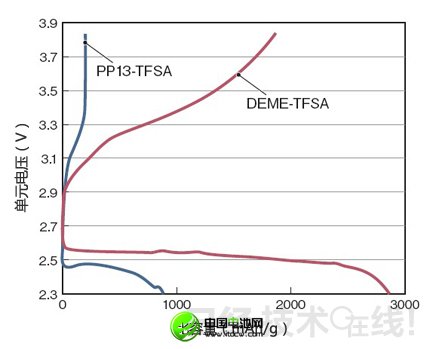 在本届电池研讨会上,丰田宣布通过在锂空气电池的电解液溶剂中采用离子液体N,N─二乙基─N─甲基─N─甲氧基铵双三氟甲基磺酰胺(DEME-TFSA),可实现与有机溶剂相当的容量(图11)注6)。
