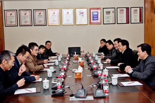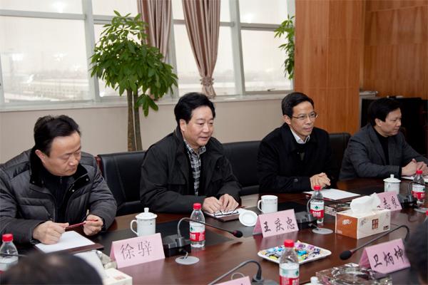 吕志良县长(右二)、王庆忠部长(左二)等县领导在听取周明明董事长汇报