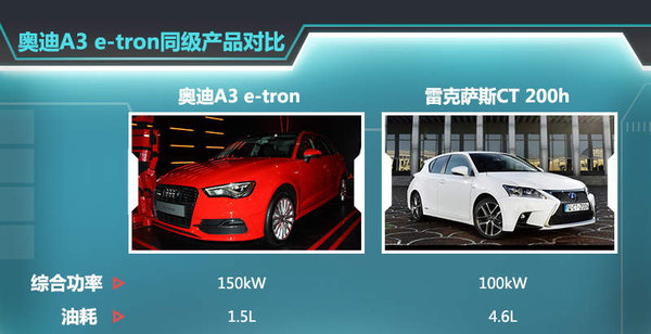 目前国内新能源车型的发展情况,插电混动车型相比纯电动车型可行性更高,在节能减排的同时活动半径可得到进一步保证。根据欧洲经济委员会(ECE)插电式混合动力汽车设计标准,奥迪A3 e-tron的百公里平均油耗仅为1.5L。相比之下,属于轻型混合动车型中的雷克萨斯CT 200h百公里油耗为4.6L,综合功率为100kW。A3 e-tron在上市后将成为奥迪品牌在华推出的首款插电混动车,这对于消费者而言将是一种新的尝试。