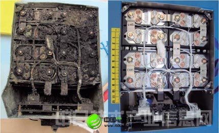 图1:日航客机发生起火事故 左为从发生起火事故的日航客机中取出的电池模块。右为正常状态。 |
