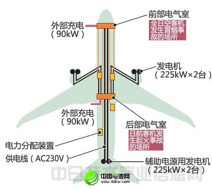 图2:日航客机和全日空客机发生异常的位置不同 787客机有前后两个电气室。其中,日航客机后部电气室、全日空客机前部电气室的电池模块出现异常。 |