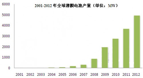 全球薄膜电池行业兴起始于2005年。据OFweek行业研究中心出版的《2013-2015年全球与中国薄膜太阳能电池行业市场研究及预测分析报告》显示,2005年以前,全球薄膜电池产量较小,年产量均在100MW以下,且增长缓慢。2005年全球薄膜电池产量首次突破100MW。2009年全球薄膜电池产量首次突破1000MW,达到1981MW。