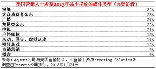 传统大众媒体曾让营销者在接触受众方面受益匪浅,但现在,受众的碎片化与小规模化以及相对更苛刻的评估标准使得营销者将重点转向数字媒体。平面媒体的利益损失最大:根据2012年10-12月的一份调查,30%的受访者希望所在企业在2013年减少对报纸和消费类杂志的投放;此外,超过20%的受访者甚至希望减少电视类投放。