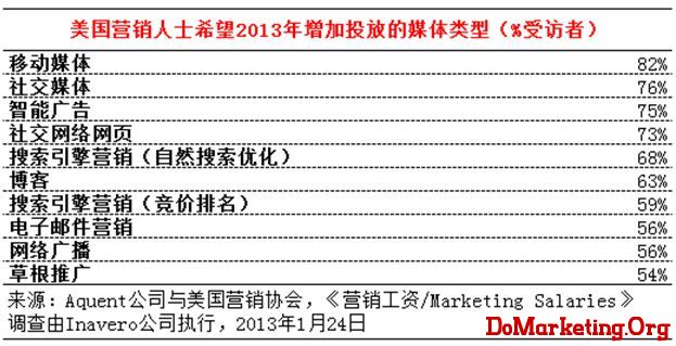 在数字媒体方面,移动媒体与社交媒体是2013年预期增长最多的两个领域。80%多的受访者将移动媒体作为增加投放的重点,同时超过四分之三的受访者将社交媒体作为重点。营销者对竞价排名(59%)和电子邮件营销(56%)的青睐度要稍低,尽管他们仍表示会更多地关注这两个渠道。