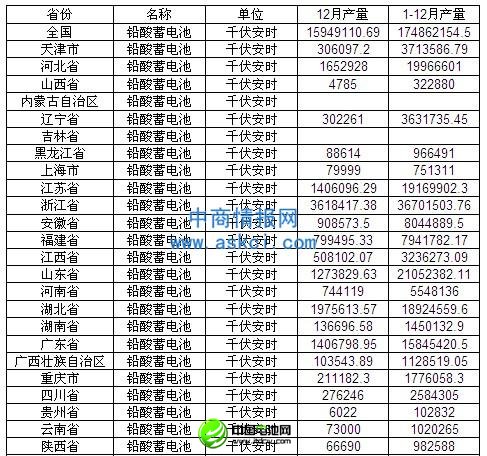 2012年1-12月中国铅酸蓄电池产量为174862154.5千伏安时。