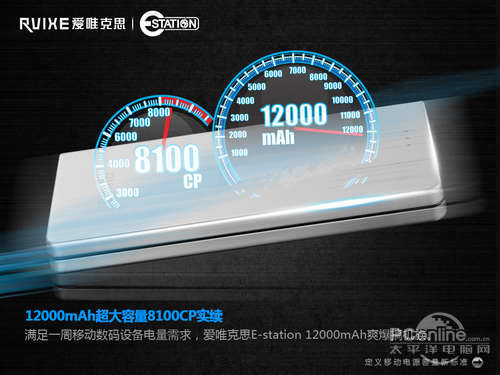 有了理想的新标准,当然也要有好的产品助力起航,来自Rvixe的E-estation就是一款率先引入实续容量的全能移动电源产品,它拥有12000mAh超大容量,8100CP实续动能,锂聚合物电池保证了电源的转换率高达91%,在市场上转换效率的表现绝对属于领先的产品。