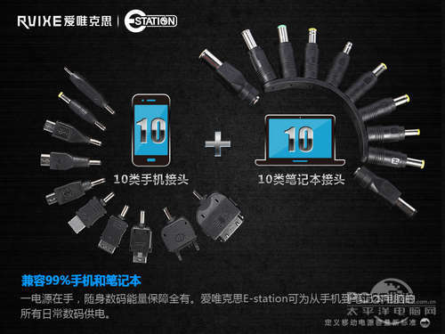 可见,实续容量的普及之旅,有了Rvixe的E-estation这款新品的引导,在市场上绝对会有一番作为。而且E-estation还拥有简约大气的外观,16mm超薄机身,精致细节工艺,时尚味道十足。而且它配备了10个笔记本充电接头和10个手机充电接头,兼容市场上99%的笔记本和手机,加上防过充、过放、过电流、短路及?稳压保护设计五大防护功能,满足绝大多数场合的移动数码设备、本本供电所需。