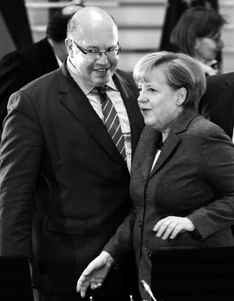 2012年11月2日,德国总理默克尔从刚抵达能源会议会场的环境、自然保护与核安全部部长Peter Altmaier身边走过。此次会议的话题之一便是可再生能源供应改革。