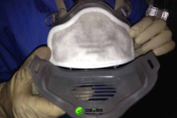 一位正在作业的工人将他戴着的口罩取下后,记者发现口罩内积存着大量的黑色含铅粉尘。 刘晓星摄