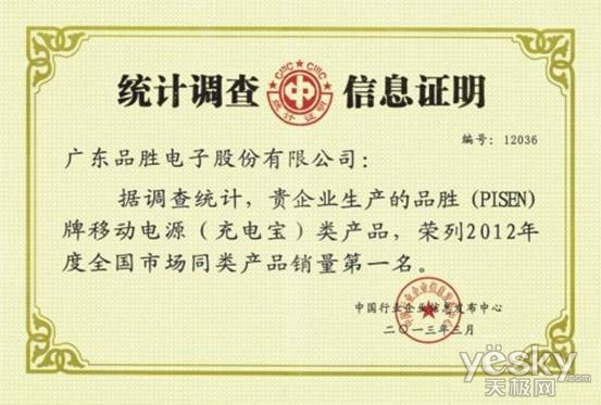 依据中国行业企业信息发布中心最新调查统计,品胜移动电源位列同类商品2012年度全国市场销量第一名,继2011年获得移动电源中国市场销量第一后,再度以超过500万台年销量蝉联行业第一,成为当之无愧的移动电源第一品牌。