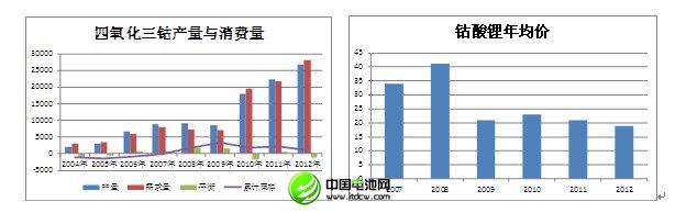 钴酸锂的上游原材料主要是四氧化三钴,据浙江某大型四氧化三钴厂商2012年的产量统计显示,2012年全年其四钴销量达5100吨以上,同比增长超过50%,跃居国内首位,在全行业供应过剩、下游需求放缓的大背景下,四钴不得不说是个实足的亮点。