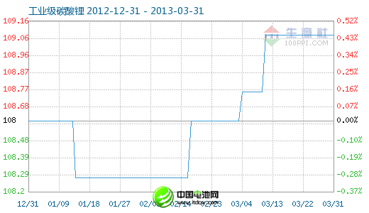 3月31日工业级碳酸锂商品指数为109.08,与昨日持平,较周期内最高点112.10点(2012-11-04)下降了2.69%,较2012年01月05日最低点98.94点上涨了10.25%。(注:周期指2011-09-01至今)